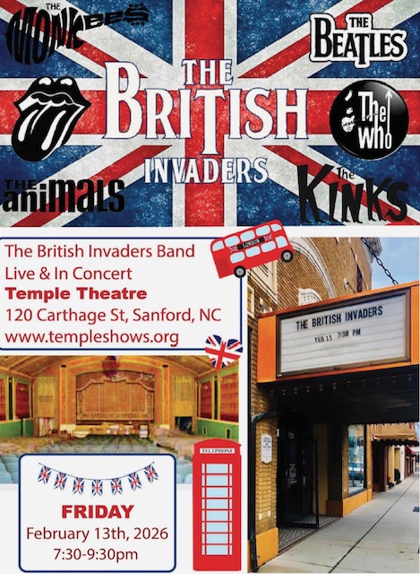 Experience the iconic sounds of the 1960s British Invasion with The British Invaders Band at Temple Theatre in Sanford, NC! Known for their authentic performances and classic British charm, the band brings to life the legendary hits of The Beatles, The Rolling Stones, The Kinks, and more. With tight harmonies and vintage flair, this concert promises a nostalgic journey that’ll have you singing and dancing all night long. Don’t miss this celebration of timeless rock ’n’ roll!